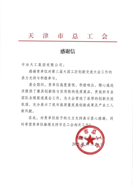 近日,工程技術(shù)總院收到天津市總工會致中冶天工感謝信。信中對中冶天工在第三屆大國工匠創(chuàng)新交流大會暨大國工匠論壇“五小”成果展示中的鼎力支持與積極參與給予充分肯定,對公司展品的“兼具創(chuàng)新性與實用性”以及專業(yè)團隊“全程高效保障”表示高度贊賞,展現(xiàn)了天津高質(zhì)量發(fā)展創(chuàng)新成果及產(chǎn)業(yè)工人新風貌,為大會營造濃厚創(chuàng)新交流氛圍注入了關鍵力量。